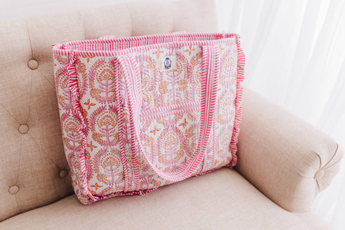 Block Print Large Quilted Ruffle Tote Bag | Dahlia